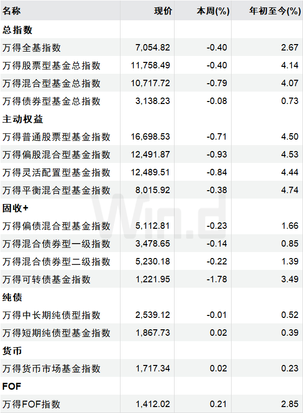 最近一周,万得基金指数整体呈现震荡回调态势。具体来看:万得全基指数下跌0.40%;万得股票型基金总指数下跌0.40%;万得混合型基金总指数下跌0.79%;万得普通股票型基金指数下跌0.71%;万得偏股混合型基金指数下跌0.93%;万得灵活配置型基金指数下跌0.84%。