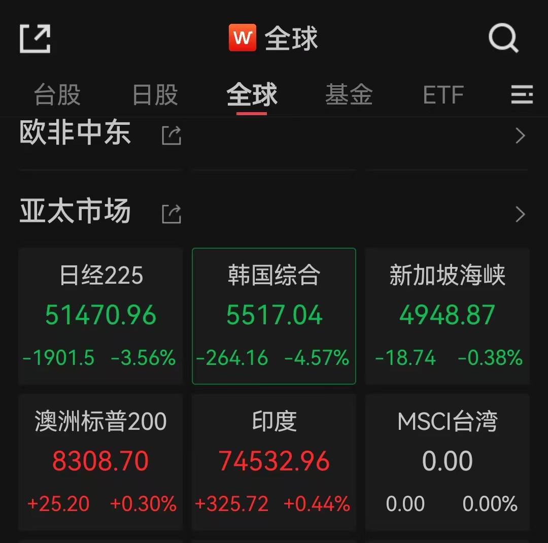 此外,日韩股市均大幅下跌。Wind数据显示,截至8:35,日经225指数跌3.56%,韩国综合指数跌4.57%。