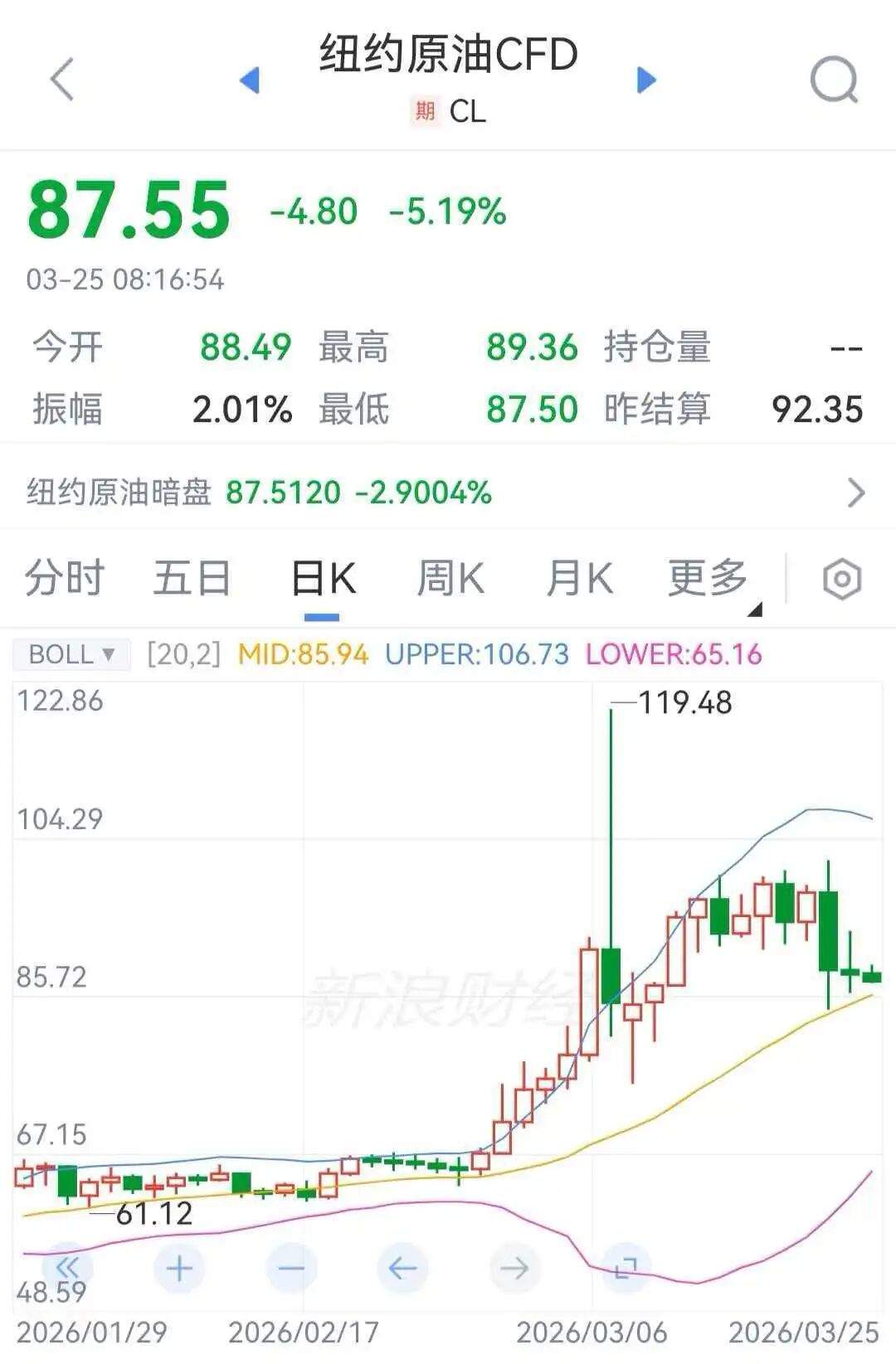 3月25日,国际油价大跌。布伦特原油期货跌近6%,报94.35美元/桶,WTI原油期货跌5.19%,报87.55美元/桶。