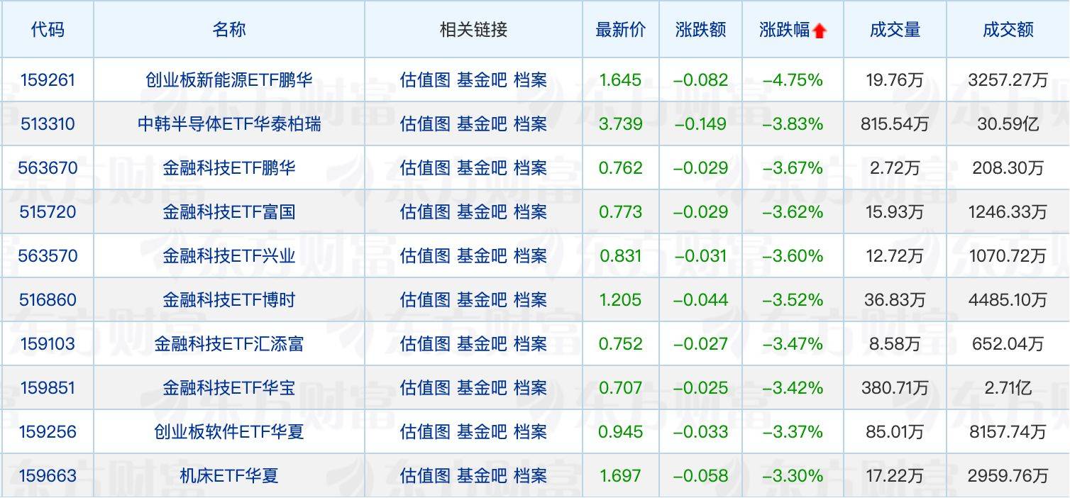 下跌方面,创业板新能源ETF鹏华领跌4.75%,多只金融科技ETF回调居前。