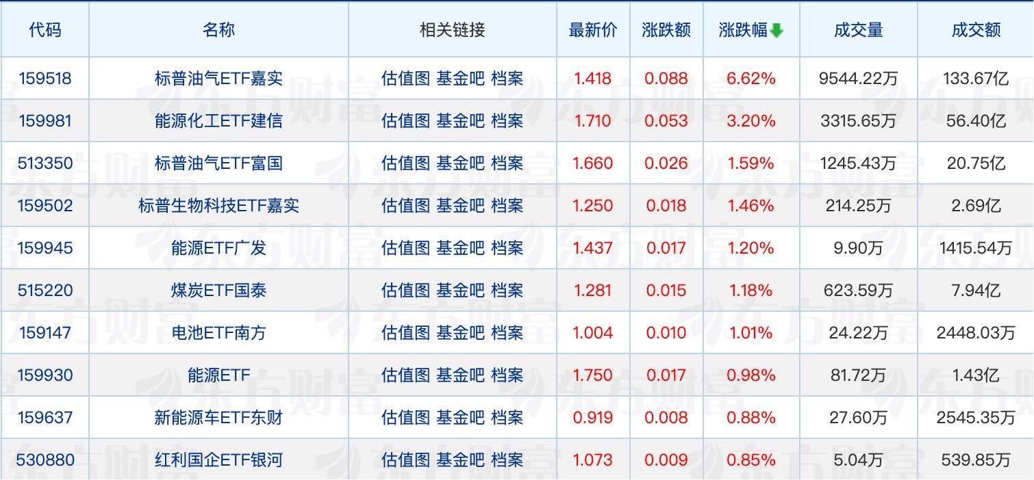 具体来看,标普油气ETF嘉实领涨6.62%。