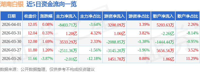 证券之星消息,截至2026年4月1日收盘,湖南白银(002716)报收于12.05元,上涨0.08%,换手率8.2%,成交量190.55万手,成交额23.07亿元。