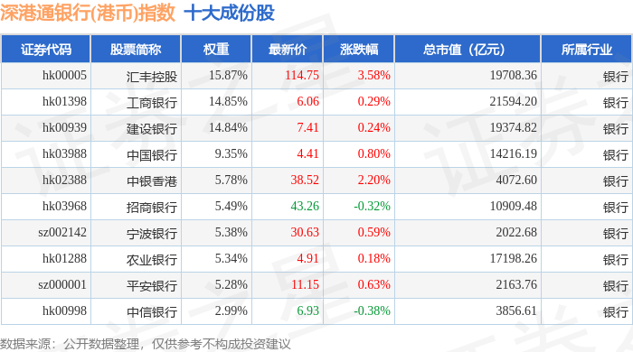 深港通银行(港币)(983082)指数十大成份股详情如下: