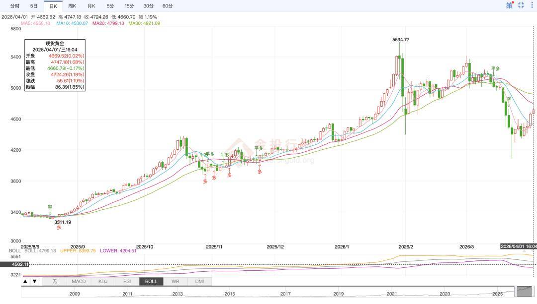 2026年,黄金市场上演了大起大落的“过山车”行情——伦敦黄金现货一度飙升到5598美元/盎司的高位,又在3月遭遇断崖式暴跌,单日最大跌幅超8%,最低探至约4099美元/盎司,已经累计回撤近30%。随后一度反弹,重回4500美元/盎司以上。