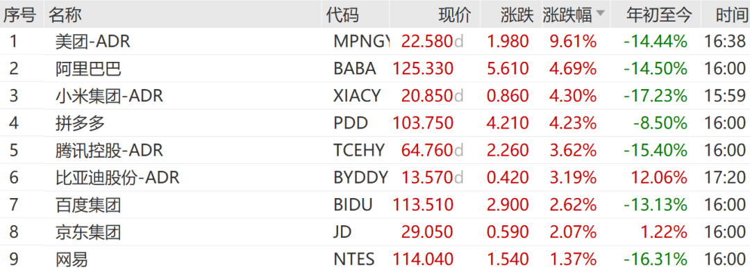 中概股普遍上涨,纳斯达克中国金龙指数涨3.05%,万得中概科技龙头指数涨4.01%,整体跑赢大盘。