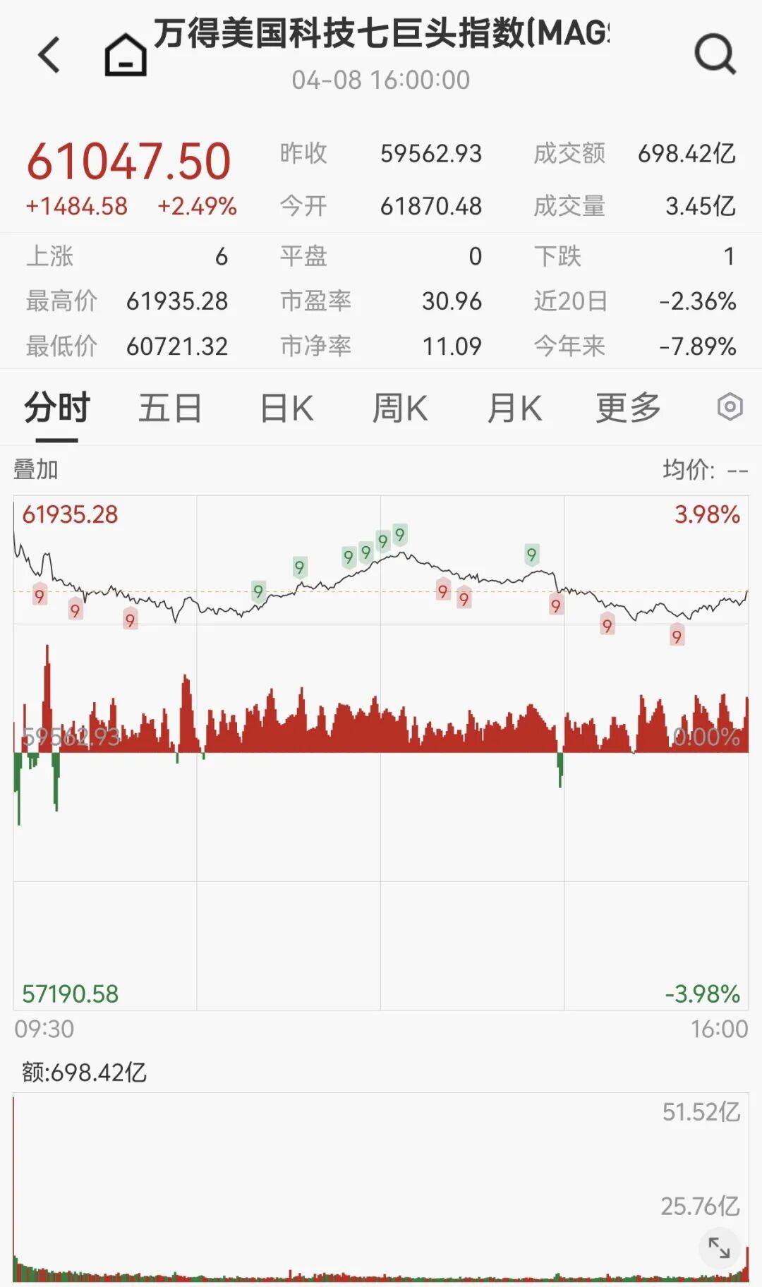 大型科技股多数上涨,万得美国科技七巨头指数涨2.49%。