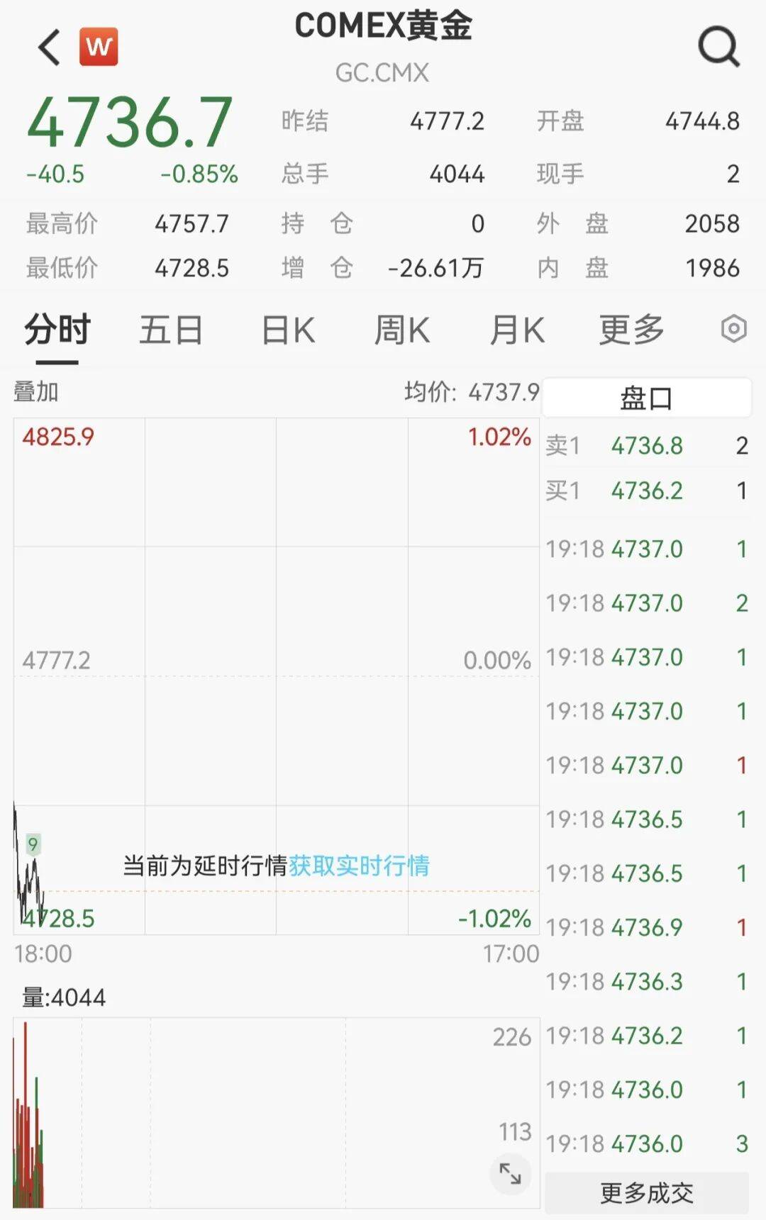 但在收市后的交易中,国际贵金属期货价格有所回落。截至记者发稿,COMEX黄金期货跌0.85%,报4736.7美元/盎司;COMEX白银期货跌2.11%,报73.80美元/盎司。