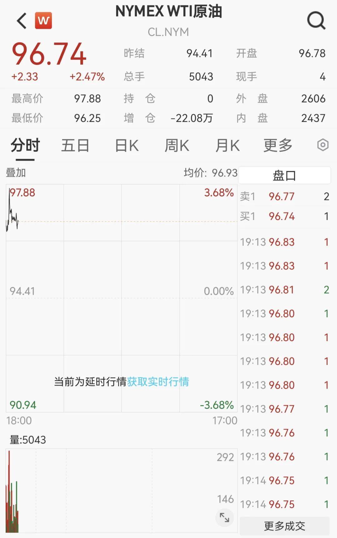 但在收市后的交易中,油价有所反弹,一度大涨3.68%,报97.88美元/桶。截至记者发稿,美油主力合约报96.74美元/桶,涨2.47%。