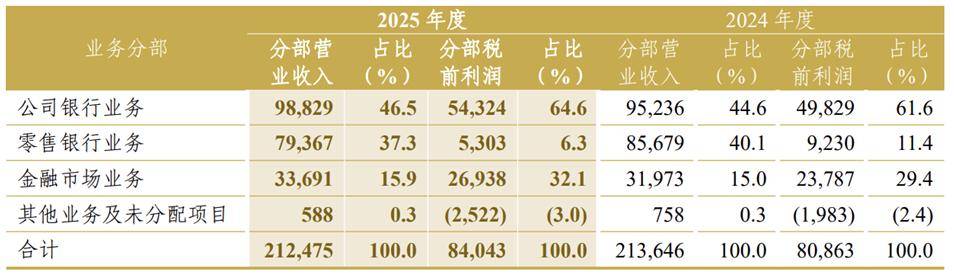 2025年,公司银行业务的资产占比由31.8%提升至34.1%,营收占比由44.6%升至46.5%,税前利润占比进一步提高至64.6%,成为全行最主要的利润来源。与此同时,金融市场业务虽然资产占比小幅下降至36.4%,但营收和利润贡献持续提升,税前利润占比达到32.1%,稳居第二大盈利板块。
