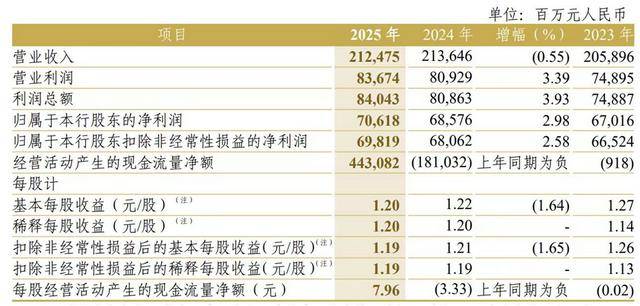 从合并报表口径来看,该行总资产达到10.13万亿元,同比增长6.28%;营业收入为2124.75亿元,同比微降0.55%;归母净利润为706.18亿元,同比增长2.98%。整体仍维持“增利不增收”的状态,规模和利润都没有明显失速。