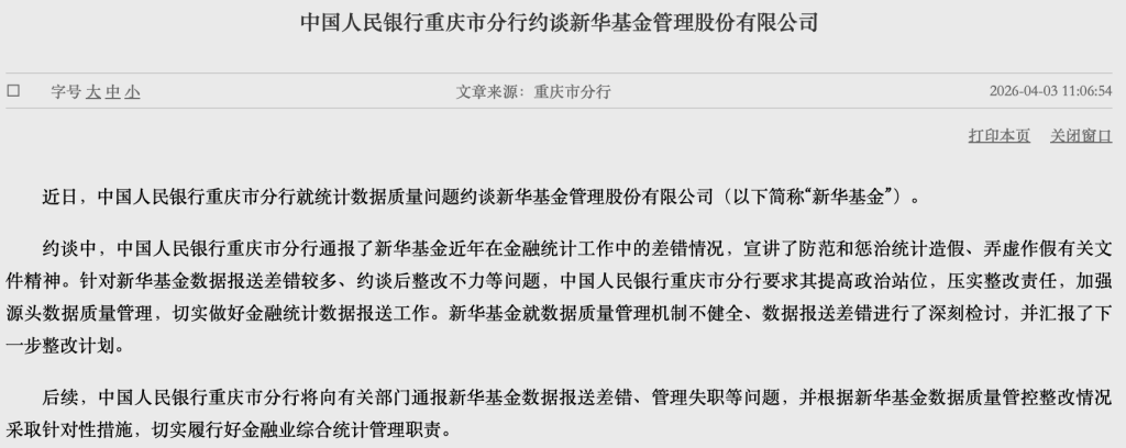 4月3日,中国人民银行(简称“央行”)重庆市分行就统计数据质量问题约谈新华基金管理股份有限公司(简称“新华基金”)。