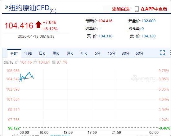 今日早盘,布伦特原油、WTI原油期货开盘跳涨8%,布伦特原油涨超7.79%,报102.969美元/桶,纽约原油涨超7.8%,报104.416美元/桶。