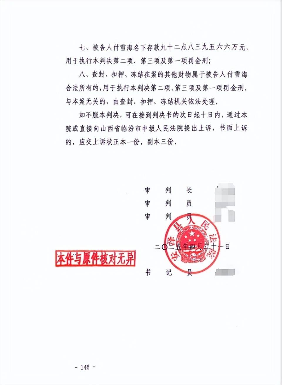 2025年6月,有网友贴出一份关于付雪海的《刑事判决书》,文书编号【(2024)晋1026刑初6号】。提及付学海因受贿罪、贪污罪、故意伤害罪,数罪并罚,决定执行有期徒刑25年,处罚金200万元;追缴违法所得941万余元,返还被害单位;追缴1211万余元,予以没收,上缴国库等。