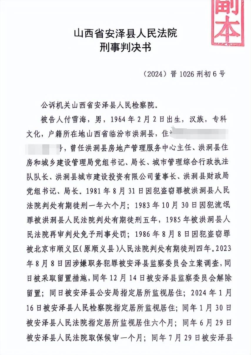 安泽县法院2025年4月21日出具的《刑事判决书》显示,付雪海在1981年8月31日、1986年8月8日分别被洪洞县法院、北京原顺义县法院判处一年六个月和四年有期徒刑。罪名均为盗窃罪。