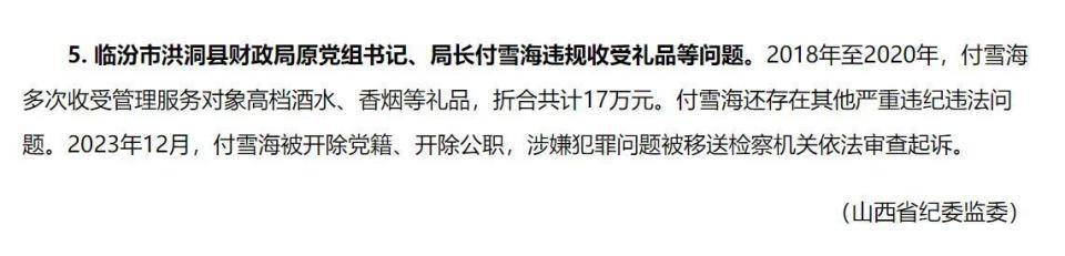 2024年6月,山西省纪委监委对5起违反中央八项规定精神典型问题进行公开通报,其中提及,2018年至2020年,付雪海多次收受管理服务对象高档酒水、香烟等礼品,折合共计17万元。付雪海还存在其他严重违纪违法问题。2023年12月,付雪海被开除党籍、开除公职,涉嫌犯罪问题被移送检察机关依法审查起诉。