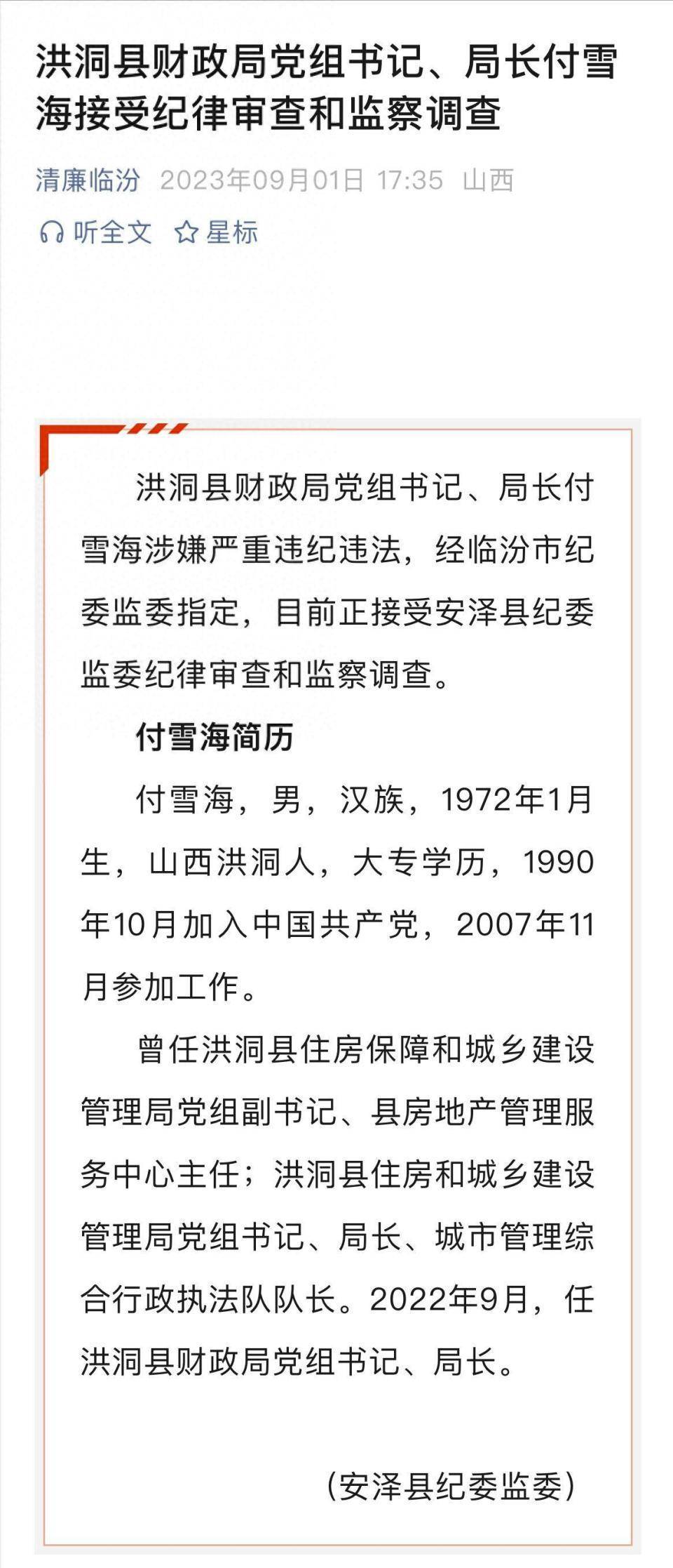 根据“清廉临汾”2023年9月1日的公开发布显示,洪洞县财政局党组书记、局长付雪海涉嫌严重违纪违法,经临汾市纪委监委指定,目前正接受安泽县纪委监委纪律审查和监察调查。
