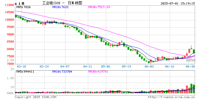 工业硅:根据SMM市场交流,2025年6月份工业硅产量环比增加6.5%,同比减少27.7%。2025年1-6月份工业硅累计产量同比下降17.8%。大厂产能占比较大且生产增或减存在变数,资金面多头快速获利平仓,工业硅日内大幅下挫,后续关注7490---7500附近支撑作用。