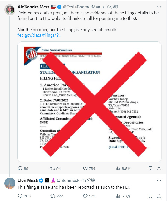 当地时间7月6日晚间,一张带有美国联邦选举委员会符号的登记簿截图在网上流传,该截图称马斯克于当天提交了注册“美国党”的正式文件。不久后马斯克本人发文辟谣称该截图并不属实。