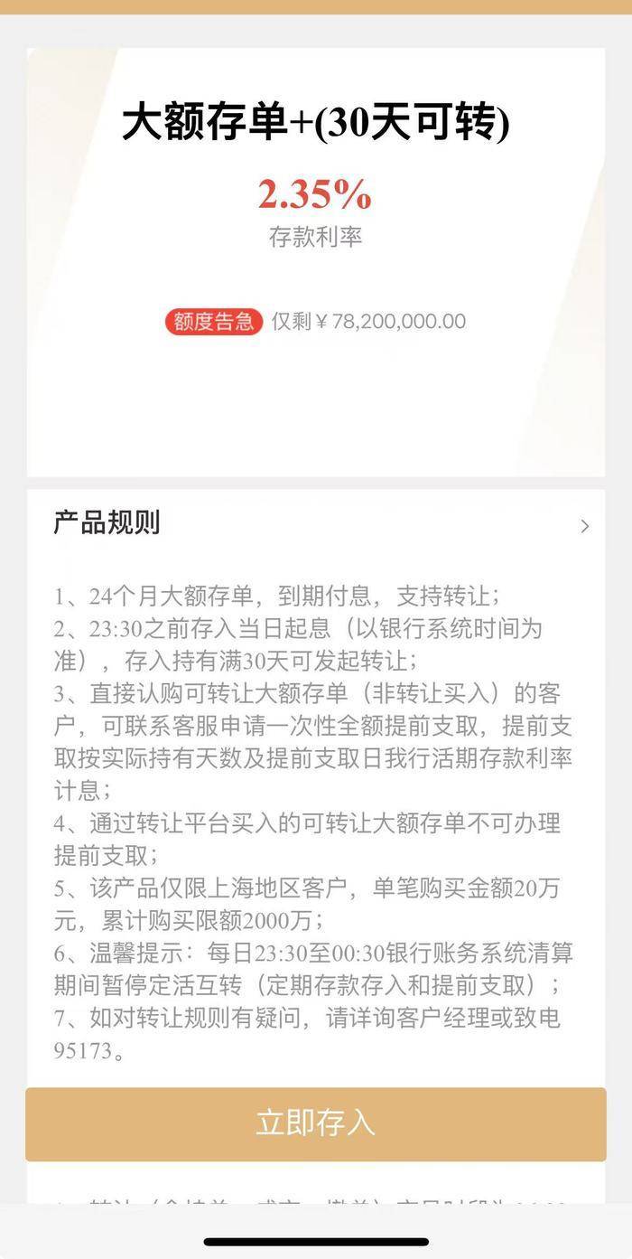 不过界面新闻记者注意到,两款产品的介绍页面均注明“仅限上海地区购买”。截至发稿时,18个月期大额存单显示已经“售罄”,2年期大额存单显示“额度告急”,剩余额度为7820万元。