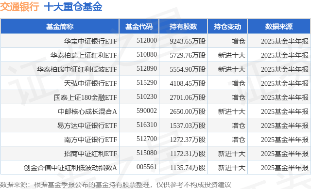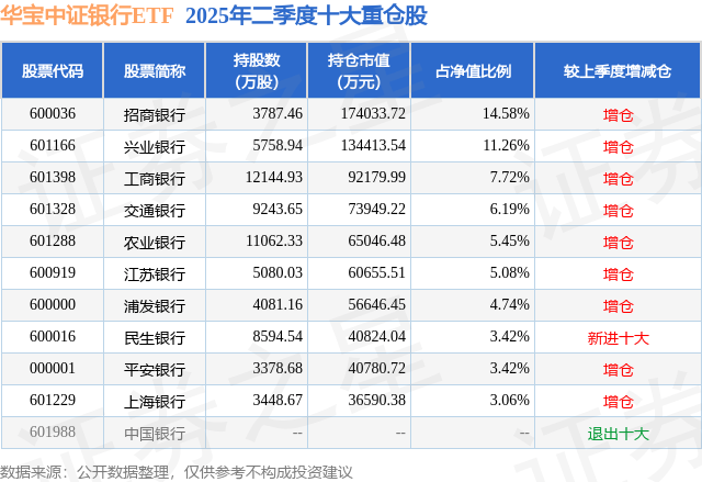 根据2025基金半年报公募基金重仓股数据,重仓该股的公募基金共180家,其中持有数量最多的公募基金为华宝基金的华宝中证银行ETF。华宝中证银行ETF目前规模为119.4亿元,最新净值0.8052(9月17日),较上一交易日下跌0.37%,近一年上涨34.86%。该公募基金现任基金经理为胡洁 丰晨成。胡洁在任的基金产品包括:华宝中证银行ETF联接A,管理时间为2012年10月16日至今,期间收益率为175.33%;华宝医疗ETF联接A,管理时间为2015年5月21日至今,期间收益率为-56.24%;华宝中证军工ETF,管理时间为2016年8月5日至今,期间收益率为36.72%;丰晨成在任的基金产品包括:华宝上证180价值ETF联接A,管理时间为2015年11月13日至今,期间收益率为95.51%;华宝上证180价值ETF,管理时间为2015年11月13日至今,期间收益率为106.92%;华宝券商ETF,管理时间为2016年8月30日至今,期间收益率为20.68%;华宝券商ETF联接A,管理时间为2018年6月27日至今,期间收益率为75.69%。