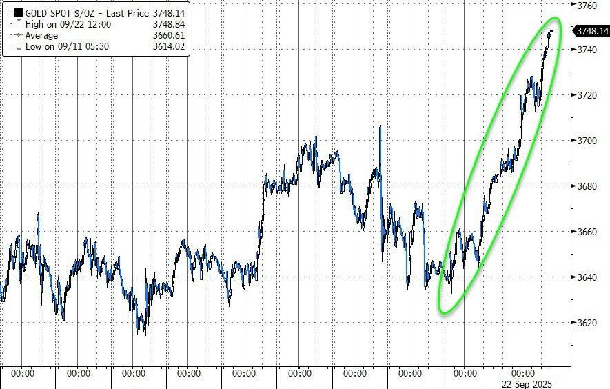 现货黄金也涨势如虹,一度触及每盎司3748.84美元的历史新高。