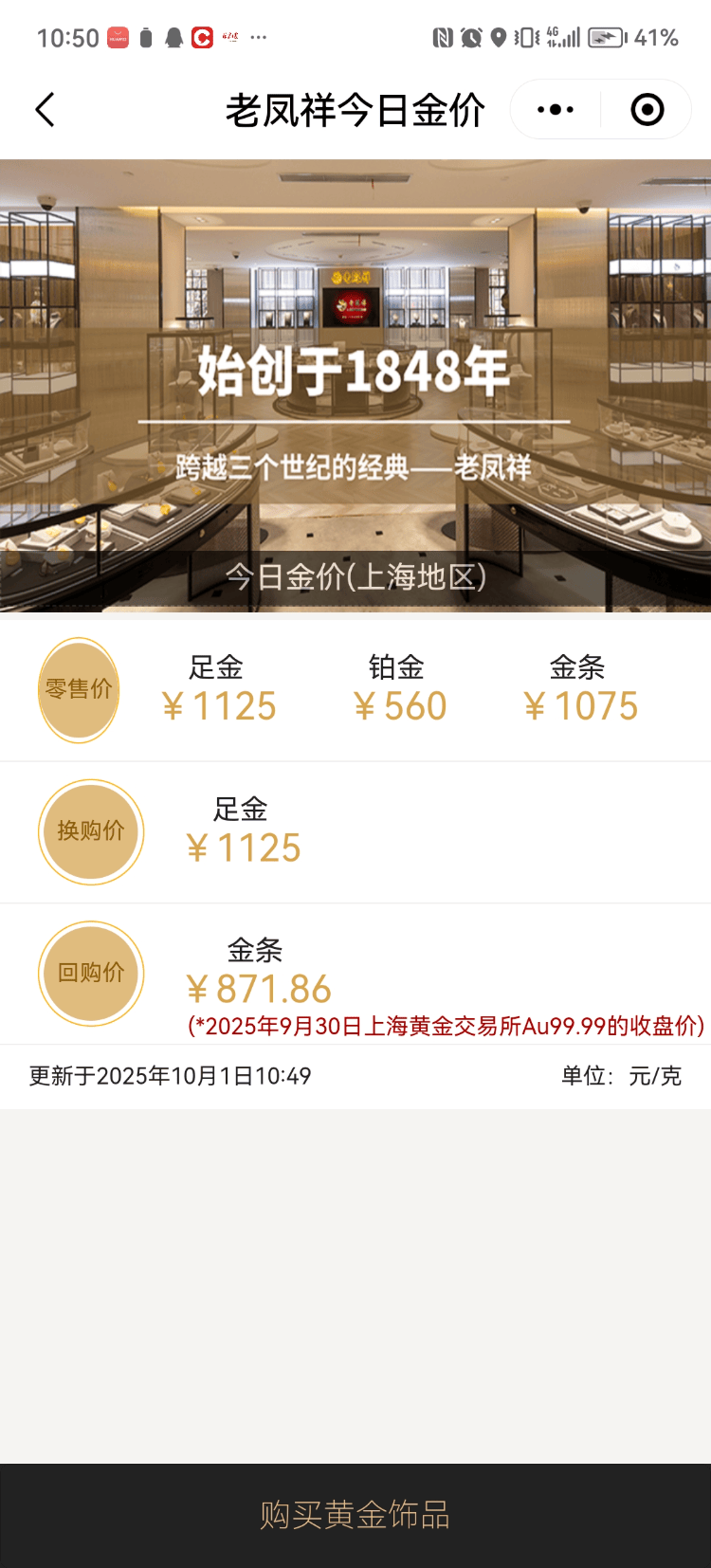 国内金饰价格方面,10月1日,上游新闻记者查询发现,周生生足金饰品标价1130元/克,老凤祥足金饰品标价1125元/克,周大福足金饰品标价1129元/克。