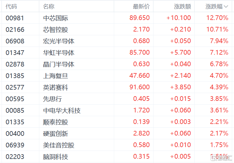半导体、芯片股走强,中芯国际涨超12%,华虹半导体、晶门半导体、上海复旦、英诺赛科、中电华大科技等跟涨。