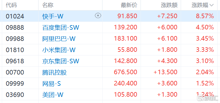 大型科技股集体走高,快手大涨超8%,百度涨超4%,阿里巴巴、小米、京东涨超3%,腾讯控股涨超2%,网易、美团涨超1%。