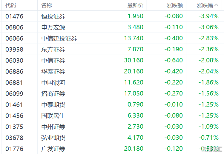 中资券商股下挫,申万宏源跌超3%,中信建投证券、东方证券、中信证券、华泰证券、中国银河、招商证券等跟跌。