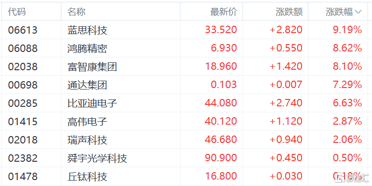 苹果概念股活跃,蓝思科技涨近9%,鸿腾精密、富智康集团、比亚迪电子、高伟电子、瑞声科技、舜宇光学科技等跟涨。