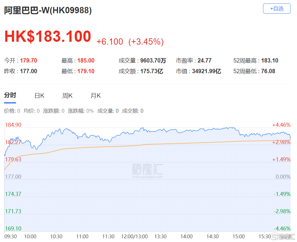 阿里巴巴涨超3%,报183.1港元,总市值34921.99亿港元。