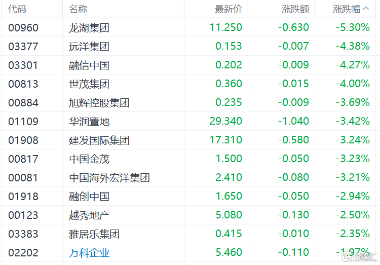 内房股低迷,龙湖集团跌超5%,远洋集团、世茂集团、华润置地、建发国际集团、中国金茂等跟跌。