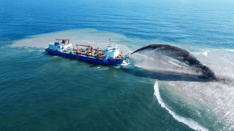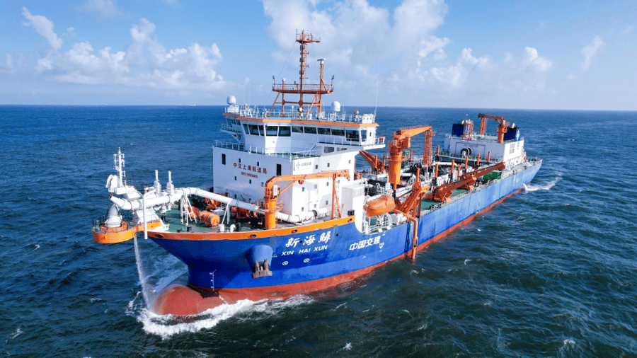 “新海鲟”轮是国内领先、国际一流的新型智能疏浚船舶,仅一个半小时的疏浚量,就能够将一个标准的足球场垫高2米多,堪称“深海金刚”。在服务“交通强国”港口建设与航道疏浚中,“新海鲟”轮是长江口深水航道维护与建设的绝对主力。