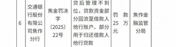 焦金罚决字〔2025〕22号行政处罚决定书显示,因贷后管理不到位,贷款资金部分回流至借款人他行账户、部分用于归还借款人他行贷款违法违规行为,交通银行股份有限公司焦作分行被罚款25万元。