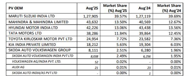 不过,多年过去,印度已超过日本,晋升为全球第三大汽车市场,而大众集团却始终未能在印度市场占据重要地位。以今年8月为例,印度市场乘用车销量合计为32.3万辆。其中,大众集团贡献了8111辆,市占率为2.51%,虽高于去年同期的1.96%,但远低于玛鲁蒂·铃木(39.57%)、马恒达(13.5%)、现代汽车(13.06%)、塔塔汽车(11.84%)、丰田(7.72%)、起亚(5.63%)等竞争对手。