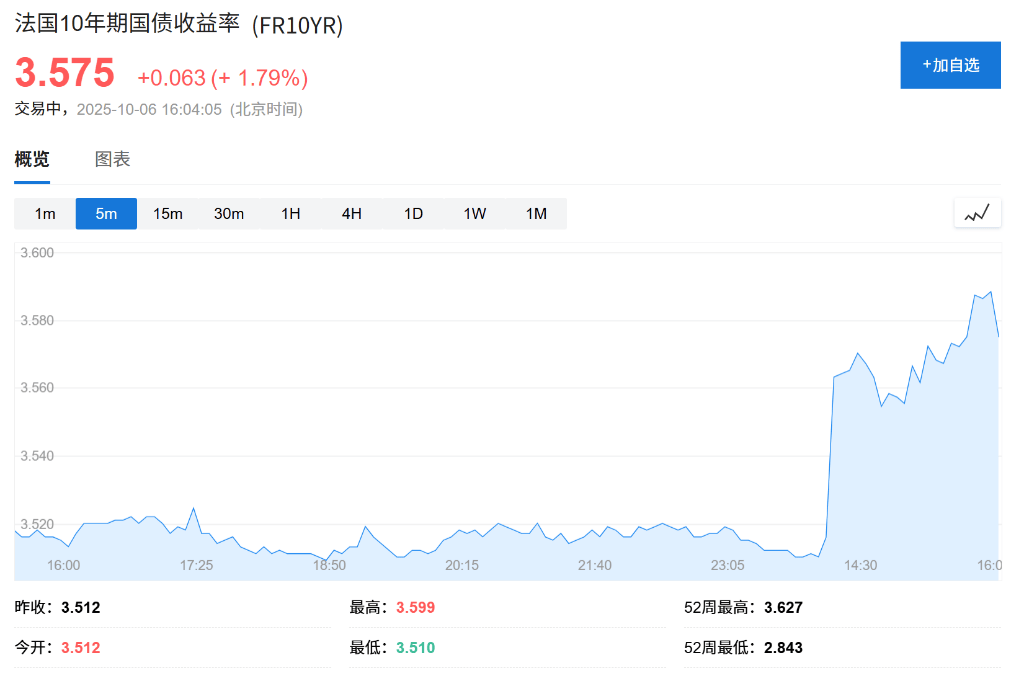 对政策敏感的10年期国债收益率跳升至3.6%,上涨了9个基点。同时,作为衡量市场对法国信用风险看法的关键指标,法国与德国10年期国债之间的利差扩大至超过89个基点,刷新了近一年来的纪录,凸显出投资者对法国财政状况的担忧情绪正在升温。