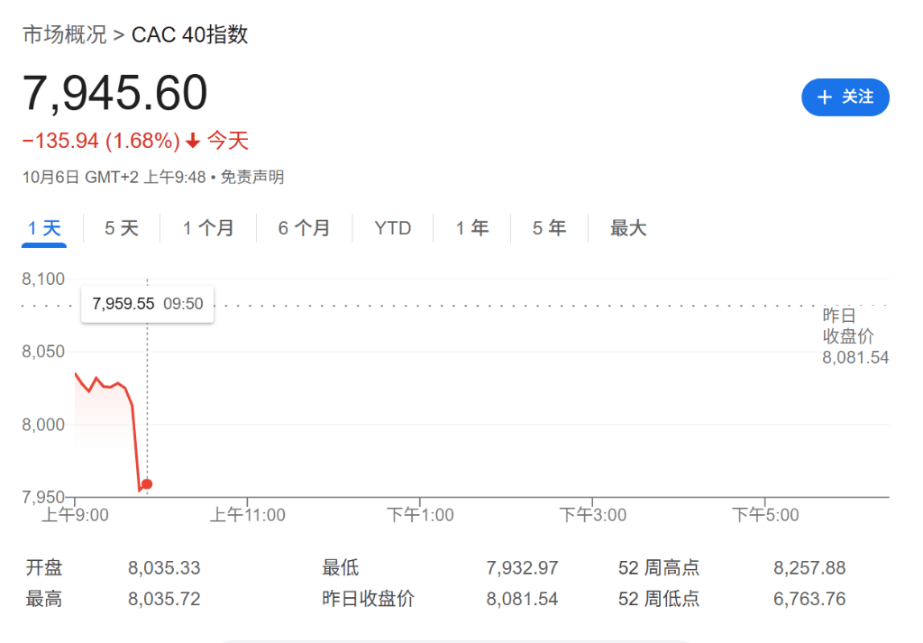 消受此影响,周一(10月6日),法国CAC 40指数下跌,欧洲股市开盘后小幅走低。欧元走低,法国国债价格下跌。欧元区银行股指数下跌0.6%,其中法国的银行股领跌。