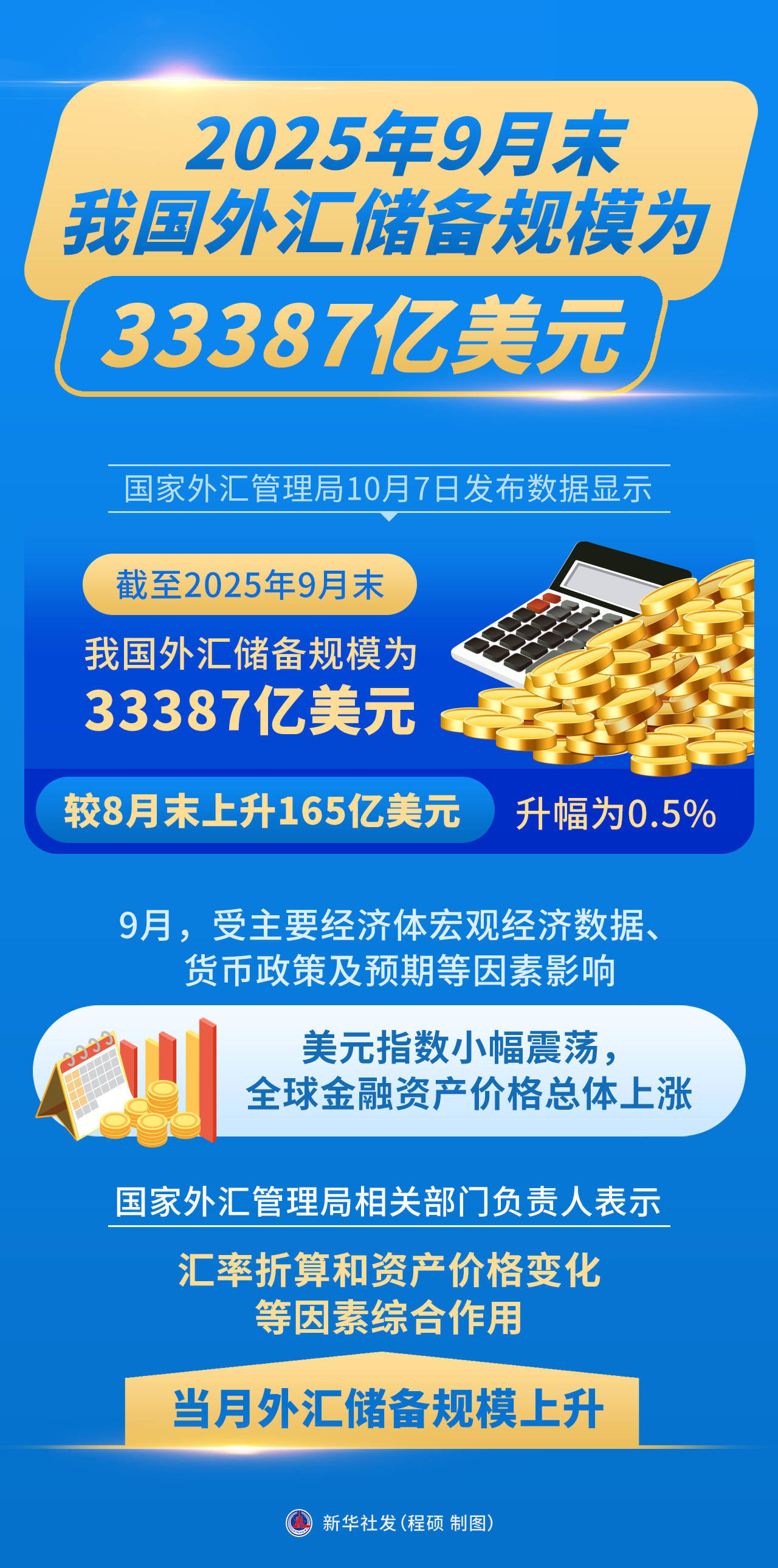 国家外汇管理局10月7日发布数据显示,截至2025年9月末,我国外汇储备规模为33387亿美元,较8月末上升165亿美元,升幅为0.5%。