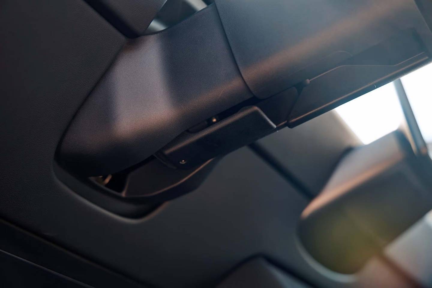 内饰是降本的重点区域,座椅采用环保皮革与织物拼接,中控台设计灵感源自 Cybertruck,方向盘改为手动调节。同时,前排座椅通风、后排座椅加热及 8 英寸后排触摸屏均被取消。