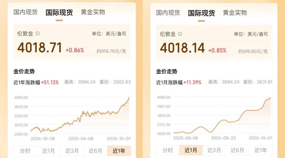 今日,国际黄金期价继续走高,盘中最高触及4020.9美元/盎司。国际现货黄金价格年内累计上涨51.13%,月内上涨11.39%。