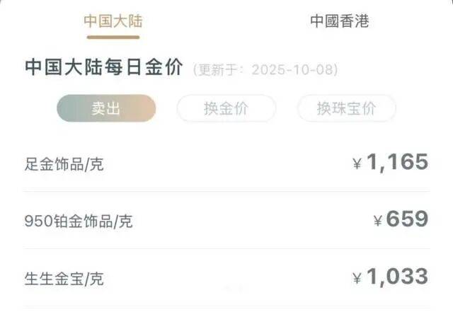 随着国际金价的走高, 10月8日,国内多个金饰品牌克价再创新高: 老庙足金饰品价格达到1176元/克, 周生生足金饰品标价达到1165元/克; 周大福为1162元/克; 老凤祥价格达到1160元/克。