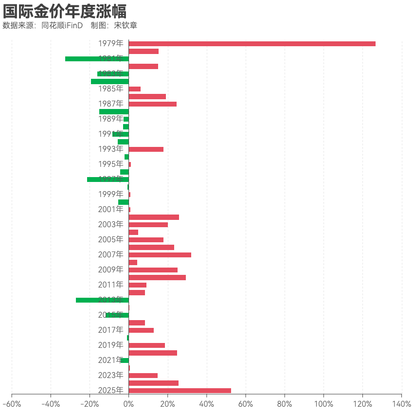 1971年,布雷顿森林体系瓦解,美元与黄金脱钩,黄金自此回归“独立的避险资产”,开启了价格市场化波动的时代。《每日经济新闻》记者统计1979年以来国际金价年度涨幅数据,一个令人吃惊的现象是,截至发稿,2025年国际金价的年内涨幅已经超过1980年以来的所有年份。
