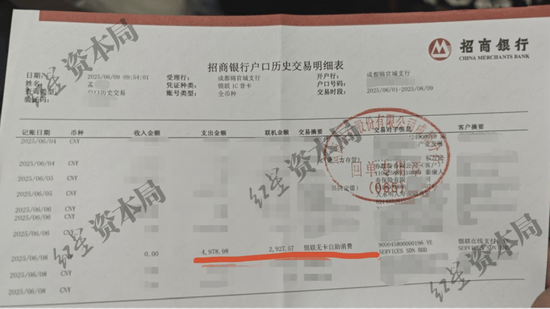 今年5月末、6月初,孟先生前往香港旅游。6月3日,他回到成都,而后,6月8日凌晨,他的招商银行储蓄卡被盗刷,被扣走4978.98元,交易摘要为“银联无卡自助消费”。