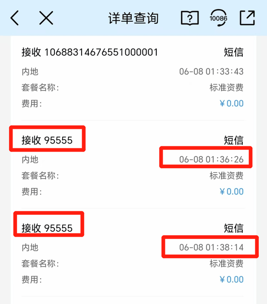 红星资本局浏览孟先生提供的短信详单发现,6月8日凌晨1时36分、1时38分,他收到过两条来自招商银行(95555)的短信,但短信具体内容无法查看。