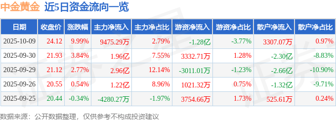 10月9日的资金流向数据方面,主力资金净流入9475.29万元,占总成交额2.79%,游资资金净流出1.28亿元,占总成交额3.77%,散户资金净流入3307.07万元,占总成交额0.97%。