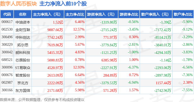 从资金流向上来看,当日数字人民币板块主力资金净流出8.31亿元,游资资金净流入4.42亿元,散户资金净流入3.89亿元。数字人民币板块个股资金流向见下表: