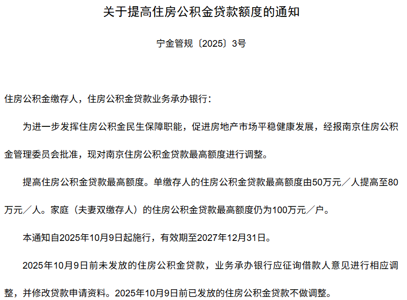 【大河财立方消息】10月9日,南京住房公积金管理中心发布《关于提高住房公积金贷款额度的通知》。