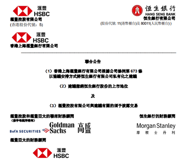 同日,恒生银行在港交所公告称,香港上海汇丰银行有限公司(汇丰亚太)作为要约人,已要求恒生银行董事会向计划股东提呈建议,根据《公司条例》第673条以协议安排方式将恒生银行私有化。若计划生效,计划股份将予以注销,计划股东每持有一股股份可获港币155元现金对价(扣除股息调整金额,如有)。