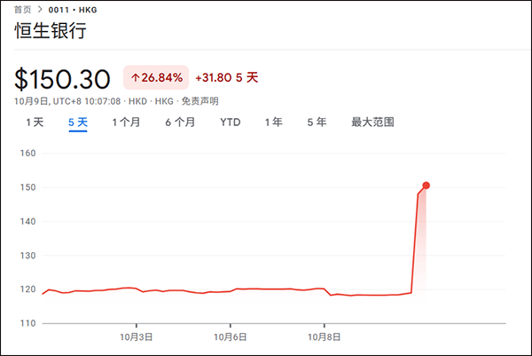 截至发稿,恒生银行(00011.hk)股价快速上涨26.22%,报价150.20港元/股。