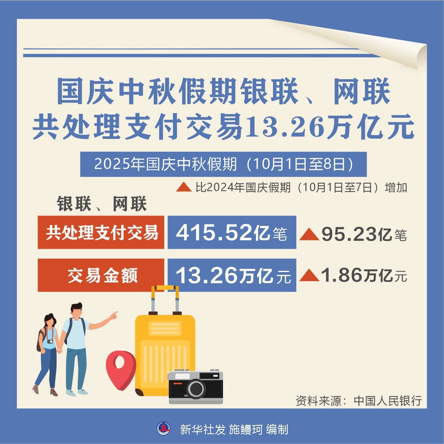 记者10月9日从中国人民银行获悉,今年国庆中秋假期(10月1日至8日),银联、网联共处理支付交易415.52亿笔,交易金额13.26万亿元。
